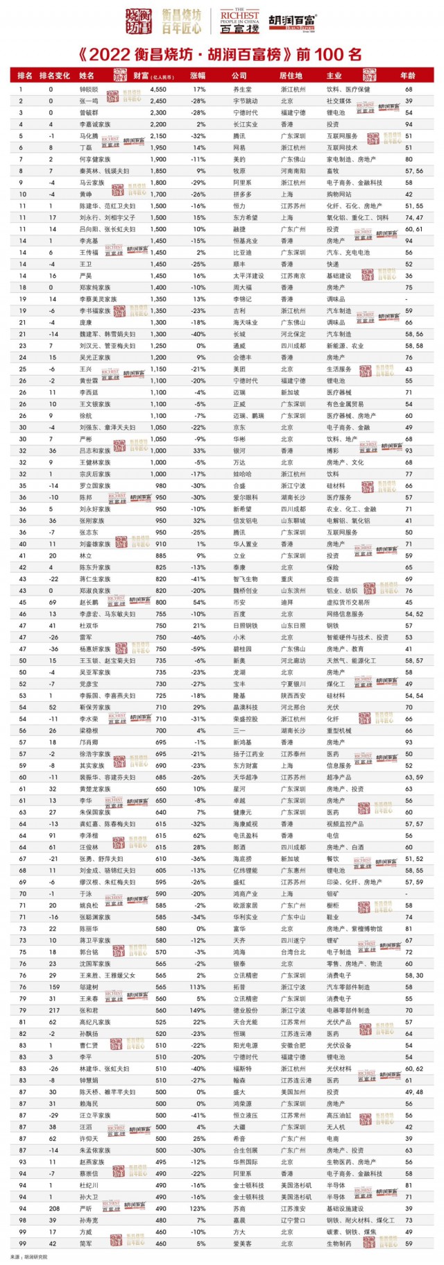 榜單顯示上榜企業(yè)家總財(cái)富比去年下降18%,至24.5萬億元。只有411位企業(yè)家財(cái)富比去年增長,其中133位新人。1,187位企業(yè)家財(cái)富比去年縮水或保持不變,其中293位今年落榜。工業(yè)產(chǎn)品、房地產(chǎn)、大健康、消費(fèi)品和食品飲料是上榜企業(yè)家的前五大財(cái)富來源。