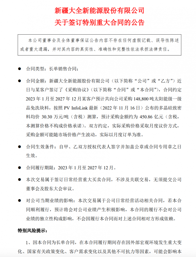 11月21日,大全能源(688303.SH)公告稱,與某客·戶簽訂《采購協(xié)議》,合同約定2023年1月至2027年12月某客戶預(yù)計采購148,800噸太陽能級一級品免洗塊料,按照PVInfolink最新公布的多晶硅致密料均價30.30萬元/噸(含稅)測算,預(yù)計采購金額約為450.86億元。
