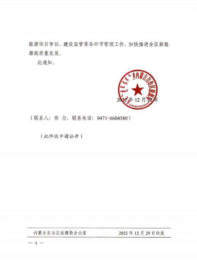 12月29日,內(nèi)蒙古自治區(qū)能源局發(fā)布關(guān)于下放部分市場化并網(wǎng)新能源項目審批權(quán)限的通知,通知指出:自本文印發(fā)之日起,燃煤自備電廠可再生能源替代工程全額自發(fā)自用新能源項目和火電靈活性改造消納新能源項目由盟市能源主管部門組織評估后審批。