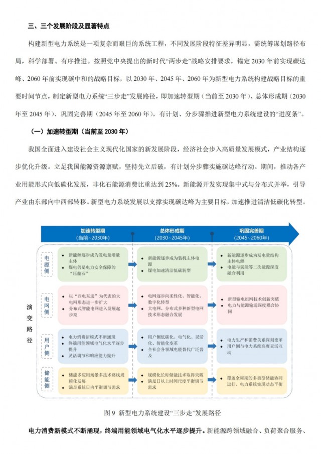 按照黨中央提出的新時代“兩步走”戰(zhàn)略安排要求,錨定2030年前實現(xiàn)碳達(dá)峰、2060年前實現(xiàn)碳中和的戰(zhàn)略目標(biāo),以2030年、2045年、2060年為新型電力系統(tǒng)構(gòu)建戰(zhàn)略目標(biāo)的重要時間節(jié)點,制定新型電力系統(tǒng)“三步走”發(fā)展路徑,即加速轉(zhuǎn)型期(當(dāng)前至2030年)、總體形成期(2030年至2045年)、鞏固完善期(2045年至2060年),有計劃、分步驟推進新型電力系統(tǒng)建設(shè)的“進度條”。
