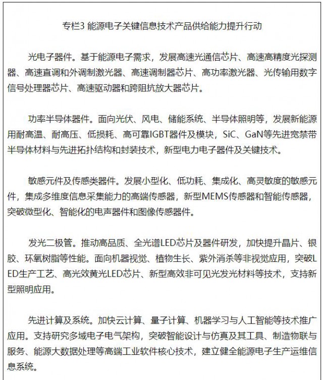 加強面向新能源領域的關鍵信息技術產(chǎn)品開發(fā)和應用,主要包括適應新能源需求的電力電子、柔性電子、傳感物聯(lián)、智慧能源信息系統(tǒng)及有關的先進計算、工業(yè)軟件、傳輸通信、工業(yè)機器人等適配性技術及產(chǎn)品。研究小型化、高性能、高效率、高可靠的功率半導體、傳感類器件、光電子器件等基礎電子元器件及專用設備、先進工藝,支持特高壓等新能源供給消納體系建設。推動能源電子產(chǎn)業(yè)數(shù)字化、智能化發(fā)展,突破全環(huán)境仿真平臺、先進算力算法、工業(yè)基礎軟件、人工智能等技術。推動信息技術相關裝備及儀器創(chuàng)新發(fā)展。