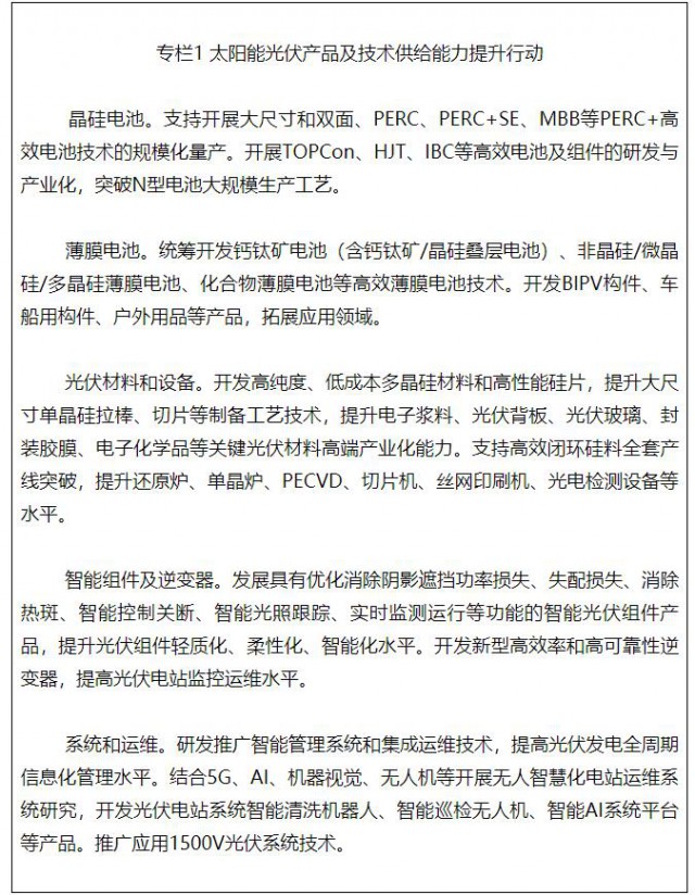 加快智能光伏創(chuàng)新突破,發(fā)展高純硅料、大尺寸硅片技術,支持高效低成本晶硅電池生產(chǎn),推動N型高效電池、柔性薄膜電池、鈣鈦礦及疊層電池等先進技術的研發(fā)應用,提升規(guī)?;慨a(chǎn)能力。鼓勵開發(fā)先進適用的智能光伏組件,發(fā)展智能逆變器、控制器、匯流箱、跟蹤系統(tǒng)等關鍵部件。加大對關鍵技術裝備、原輔料研發(fā)應用的支持力度。鼓勵開發(fā)安全便捷的戶用智能光伏系統(tǒng),鼓勵發(fā)展光伏充電寶、穿戴裝備、交通工具等移動能源產(chǎn)品。探索建立光伏“碳足跡”評價標準并開展認證。加快構(gòu)建光伏供應鏈溯源體系,推動光伏組件回收利用技術研發(fā)及產(chǎn)業(yè)化應用。