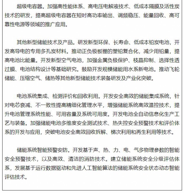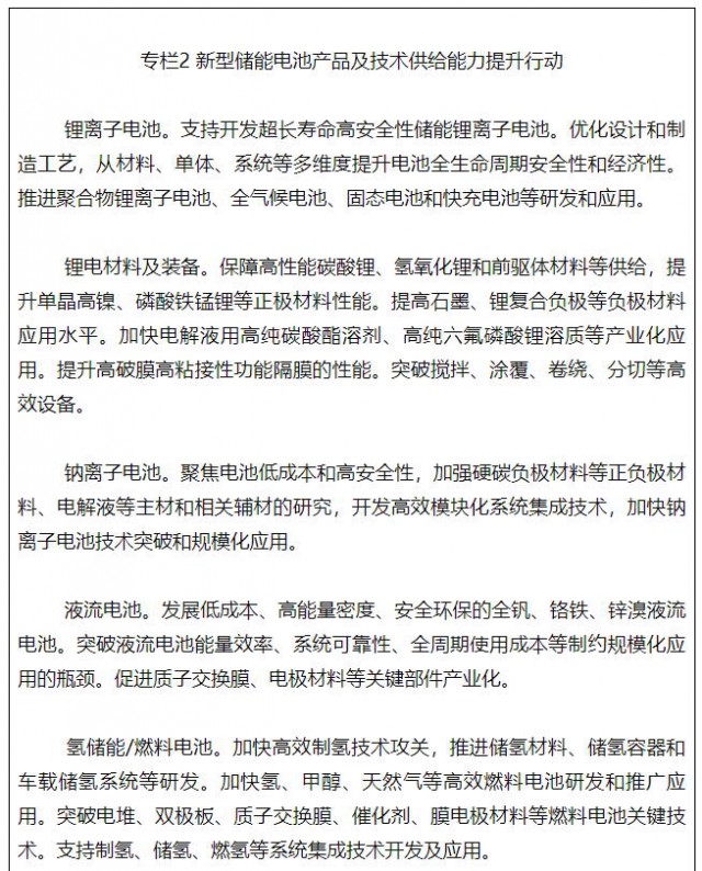 加強新型儲能電池產(chǎn)業(yè)化技術攻關,推進先進儲能技術及產(chǎn)品規(guī)?;瘧?。研究突破超長壽命高安全性電池體系、大規(guī)模大容量高效儲能、交通工具移動儲能等關鍵技術,加快研發(fā)固態(tài)電池、鈉離子電池、氫儲能/燃料電池等新型電池。推廣智能化生產(chǎn)工藝與裝備、先進集成及制造技術、性能測試和評估技術。提高鋰、鎳、鈷、鉑等關鍵資源保障能力,加強替代材料的開發(fā)應用。推廣基于優(yōu)勢互補功率型和能量型電化學儲能技術的混合儲能系統(tǒng)。支持建立鋰電等全生命周期溯源管理平臺,開展電池碳足跡核算標準與方法研究,探索建立電池產(chǎn)品碳排放管理體系。