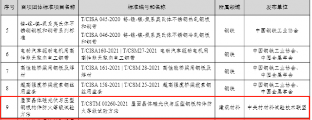 依據(jù)工信部函【2022】272號(hào)--工業(yè)和信息化部關(guān)于公布2022年團(tuán)體標(biāo)準(zhǔn)應(yīng)用示范項(xiàng)目的通告,中關(guān)村材料試驗(yàn)技術(shù)聯(lián)盟(CSTM)發(fā)布的標(biāo)準(zhǔn)《屋面晶體硅光伏與壓型鋼板構(gòu)件防火等級(jí)試驗(yàn)方法》(T/CSTM 00260-2021)入圍2022年團(tuán)體標(biāo)準(zhǔn)應(yīng)用示范項(xiàng)目。