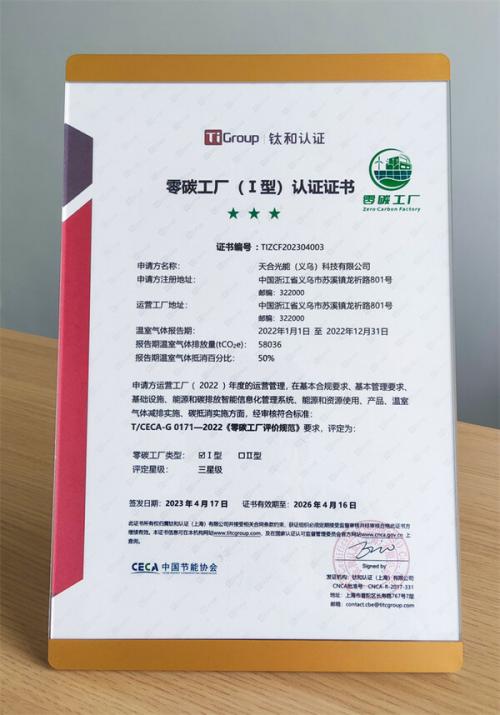 2023年4月11日~12日,零碳工廠授權(quán)評(píng)價(jià)機(jī)構(gòu)--鈦和認(rèn)證依據(jù)《零碳工廠評(píng)價(jià)規(guī)范》,從合規(guī)要求、管理要求、基礎(chǔ)設(shè)施、能源和碳排放智能信息化管理系統(tǒng)、能源和資源使用、產(chǎn)品生態(tài)設(shè)計(jì)、溫室氣體減排實(shí)施、碳抵消實(shí)施八項(xiàng)一級(jí)指標(biāo)對(duì)義烏基地進(jìn)行了詳細(xì)的評(píng)估和審核,義烏基地最終獲得了綜合評(píng)分79.68(該等級(jí)滿分為80分)的高分,自主減排后完成了對(duì)直接溫室氣體排放和輸入能源間接溫室氣體排放抵消50%,成功獲得了由鈦和認(rèn)證集團(tuán)頒發(fā)的2022年度的零碳工廠證書,成為太陽能行業(yè)首位獲第三方授權(quán)評(píng)價(jià)機(jī)構(gòu)認(rèn)證的零碳工廠企業(yè)。