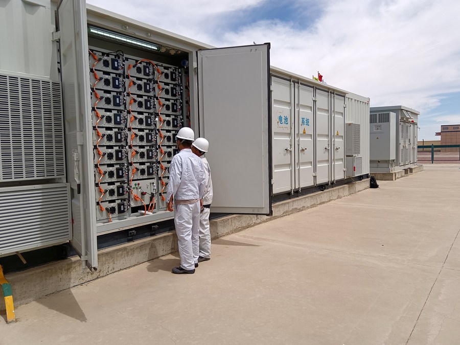 7月6日,工作人員在內(nèi)蒙古自治區(qū)錫林郭勒盟蘇尼特右旗20萬千瓦牧光儲綜合示范項目現(xiàn)場進行巡檢。新華社發(fā)(郭玉軍 攝)