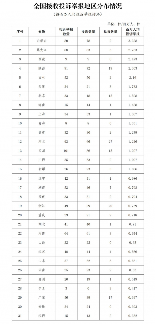 各省(自治區(qū)、直轄市)按照接收投訴舉報(bào)數(shù)量排序,四川、河北、陜西、黑龍江、內(nèi)蒙古排在全國前5位。其中:按投訴數(shù)量排序,四川、黑龍江、內(nèi)蒙古、陜西、河北排在全國前5位;按舉報(bào)數(shù)量排序,河北、浙江、陜西、廣東、北京(四川并列)排在全國前5位;按百萬人均投訴舉報(bào)數(shù)量排序,內(nèi)蒙古、黑龍江、西藏、陜西、吉林排在全國前5位。(全國接收投訴舉報(bào)地區(qū)分布情況詳見附件1)