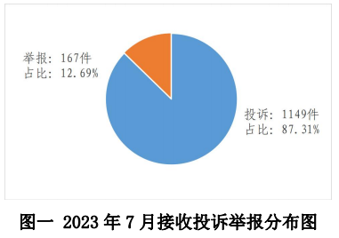 2023年7月,12398熱線共接收投訴舉報(bào)1316件,環(huán)比增長39.70%、同比下降27.01%。其中:投訴1149件,環(huán)比增長41.85%、同比下降33.66%;舉報(bào)167件,環(huán)比增長26.52%、同比增長135.21%。