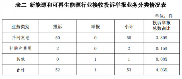 新能源和可再生能源行業(yè)排在第二位,數(shù)量為53件、占投訴舉報(bào)總數(shù)的4.03%,主要集中在并網(wǎng)發(fā)電、補(bǔ)貼和費(fèi)用等方面。