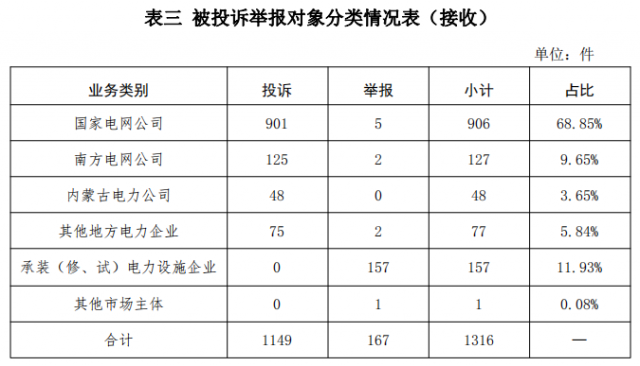 供電企業(yè)1158件、占投訴舉報(bào)總數(shù)的87.99%,其中國家電網(wǎng)公司906件、占投訴舉報(bào)總數(shù)的68.85%,南方電網(wǎng)公司127件、占投訴舉報(bào)總數(shù)的9.65%,內(nèi)蒙古電力公司48件、占投訴舉報(bào)總數(shù)的3.65%,其他地方電力企業(yè)77件、占投訴舉報(bào)總數(shù)的5.84%;承裝(修、試)電力設(shè)施企業(yè)157件、占投訴舉報(bào)總數(shù)的11.93%;其他市場主體1件、占投訴舉報(bào)總數(shù)的0.08%。