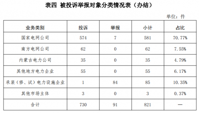 從被投訴舉報(bào)對象看,供電企業(yè)733件、占投訴舉報(bào)總數(shù)的89.28%,其中國家電網(wǎng)公司581件、占比70.77%,南方電網(wǎng)公司62件、占比7.55%,內(nèi)蒙古電力公司35件、占比3.65%,其他地方電力企業(yè)55件、占比6.17%;承裝(修、試)電力設(shè)施企業(yè)85件、占比10.35%;其他市場主體3件、占比0.37%。