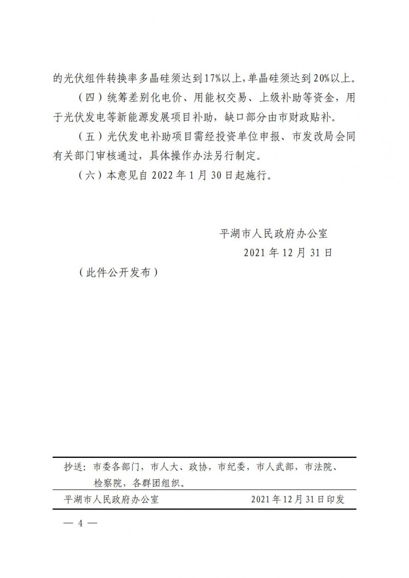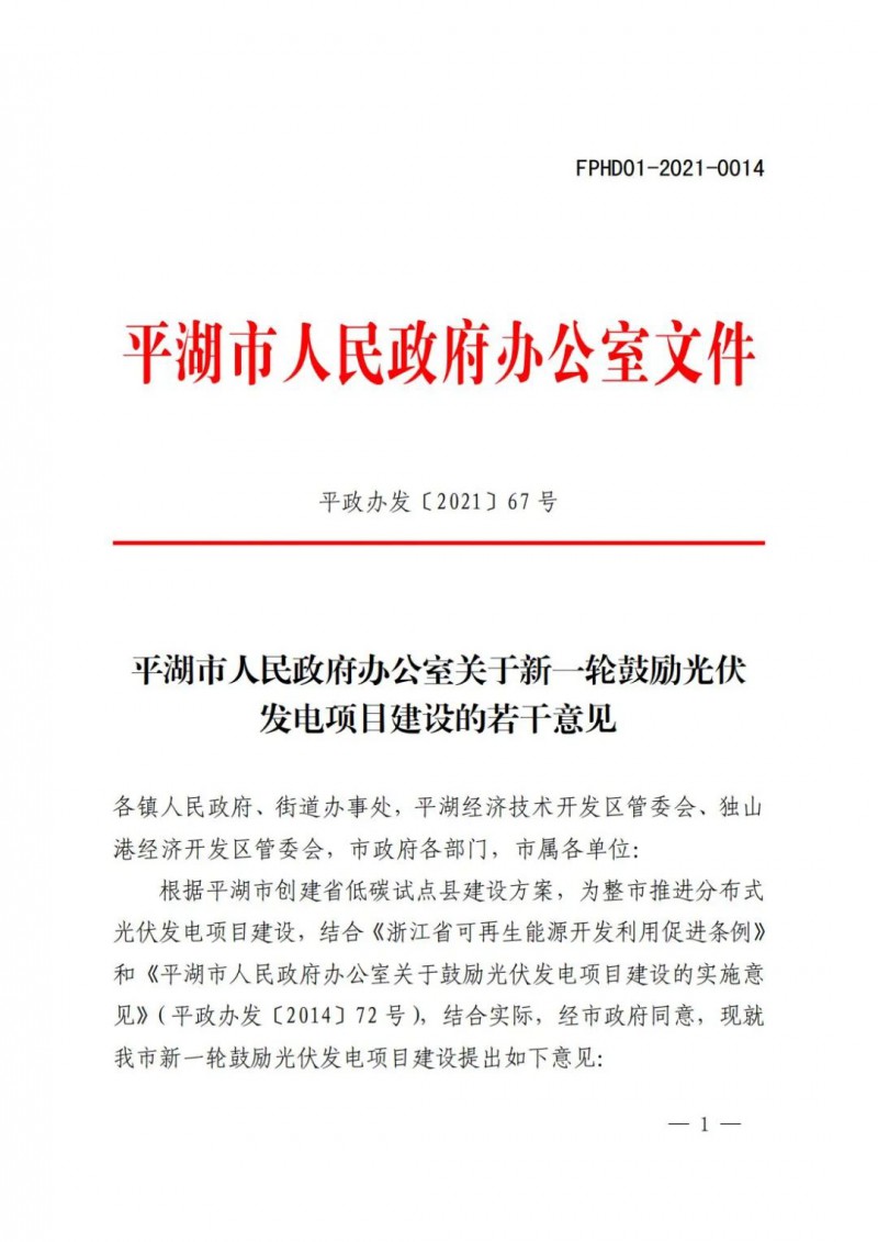 1月11日,平湖市人民政府發(fā)布了關于新一輪鼓勵光伏發(fā)電項目建設的若干意見。明確到“十四五”末,平湖市光伏發(fā)電裝機容量達到600兆瓦以上,實際新增200兆瓦以上,年平均新增裝機容量在40兆瓦以上。