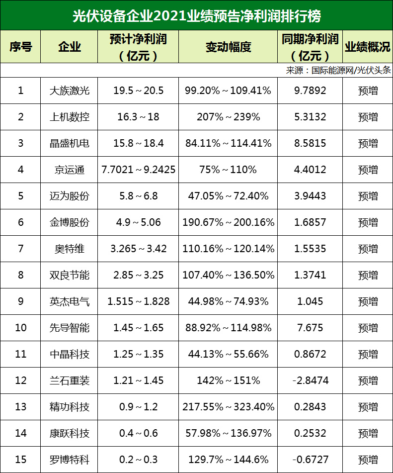 其中凈利潤(rùn)增長(zhǎng)最多的為大族激光,2021年預(yù)計(jì)凈利潤(rùn)在19.5~20.5億元之間,增幅在99.20%~109.41%之間。大族激光主營(yíng)激光技術(shù)設(shè)備,為光伏行業(yè)提供專用設(shè)備和解決方案。大族激光業(yè)績(jī)預(yù)告中提到,公司持續(xù)加大行業(yè)專用設(shè)備業(yè)務(wù)的研發(fā)和投入,PCB行業(yè)專用設(shè)備、新能源動(dòng)力電池行業(yè)專用設(shè)備、Miniled專用設(shè)備、Led封裝設(shè)備等業(yè)務(wù)訂單及發(fā)貨均較上年大幅增長(zhǎng)。