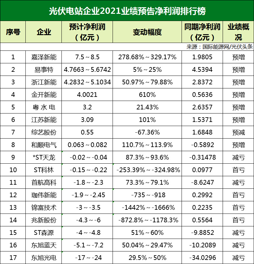 2021年由于光伏產(chǎn)業(yè)鏈上游價(jià)格暴漲,導(dǎo)致光伏產(chǎn)業(yè)鏈末端的光伏企業(yè)承受了很大壓力,光伏新增裝機(jī)不及預(yù)期。這直接反映在電站企業(yè)的財(cái)務(wù)報(bào)告中。17家與光伏電站相關(guān)的企業(yè)8家凈利潤(rùn)為正值,9家處于虧損狀態(tài)。
