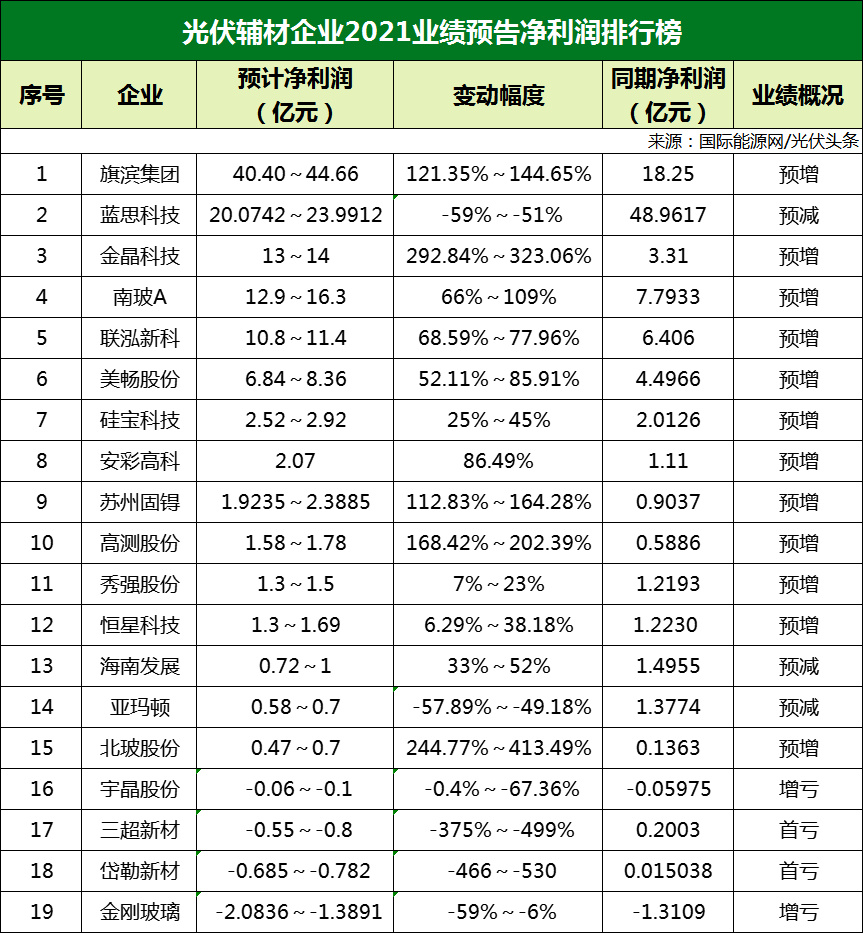 2021年的光伏產(chǎn)業(yè)鏈不僅硅料上漲,光伏膠膜、銀漿等輔材也有不同程度的上漲,光伏玻璃由于受此前價(jià)格上漲的影響,一直處于高位。這直接反映在一眾光伏輔材企業(yè)的預(yù)增公告中。