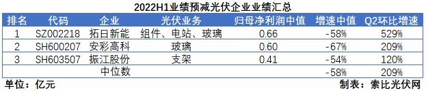 業(yè)績預減企業(yè)中,主要以光伏玻璃和光伏支架企業(yè)為主,業(yè)績降幅中值達到58%。其中,光伏玻璃企業(yè)主要受到去年一季度光伏玻璃價格處于高位的影響。PV Infolink數(shù)據(jù)顯示,2022年上半年2.0鍍膜玻璃平均價格為20.61元/平方米,較去年同期的26.62元/平方米下降23%。不過,從二季度的環(huán)比增速來看,3家企業(yè)的邊際改善較為顯著,中值達到209%,下半年的經(jīng)營業(yè)績有望持續(xù)提升。