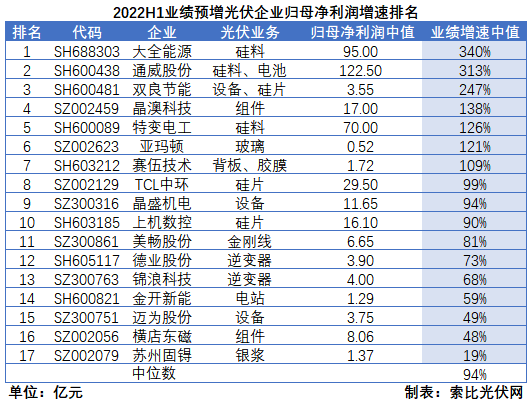 截至7月15日,兩市共有29家光伏企業(yè)發(fā)布2022年半年度業(yè)績預告。其中,預增企業(yè)17家,扭虧企業(yè)5家,預減企業(yè)3家,預虧企業(yè)4家。硅料、硅片以及設備企業(yè)業(yè)績增速居前,而受硅料價格暴漲影響較大的專業(yè)化電池及組件企業(yè)經(jīng)營業(yè)績則出現(xiàn)顯著分化。