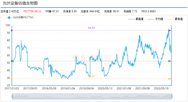 自4月27日以來,光伏板塊全線暴漲,中證光伏產(chǎn)業(yè)指數(shù)最高漲幅高達(dá)79%,股價(jià)翻倍的個(gè)股更是不在少數(shù)。隨著持續(xù)的上漲,光伏板塊的估值水平也“水漲船高”。Choice數(shù)據(jù)顯示,期間光伏板塊的PE(TTM)最高達(dá)到93.53倍,為歷史最高水平。