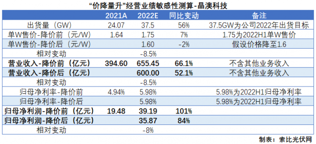 按照同樣的方法測算,晶澳科技和晶科能源的營收規(guī)模較降價(jià)前分別下降8.5%和9.6%,營收增速由66.1%和76.2%下降至52.1%和59.3%。由于晶澳科技凈利率水平并未出現(xiàn)顯著下滑,因此如果延續(xù)當(dāng)前的水平,則降價(jià)后業(yè)績增速會(huì)由101%下降至84.1%。而晶科能源在凈利率水平恢復(fù)到2020年的假設(shè)下,業(yè)績增速將由降價(jià)前的69.8%提升至75.4%。