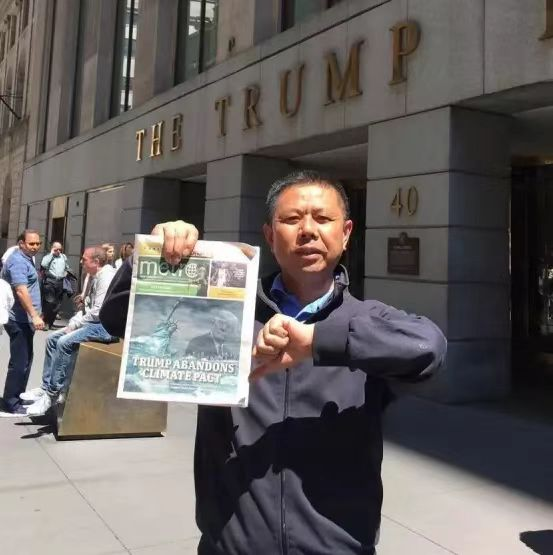 2017年,在特朗普宣布退出巴黎氣候協(xié)定的第二天,憤怒的高紀凡便一個人跑到紐約特朗普大廈門前,右手拿著剛剛印出來的報紙,左手大拇指朝下,抗議的同時還不忘招賢納士:歡迎全球致力于低碳技術創(chuàng)新的人到中國發(fā)展。
