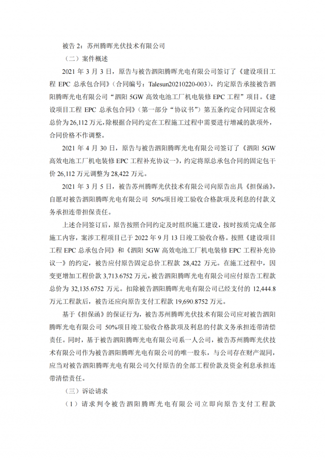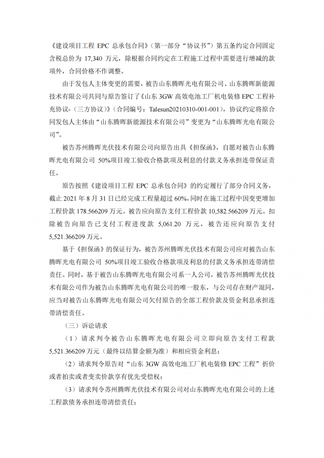 2020年~2021年期,十一科技與蘇州騰暉的六家全資子公司泗陽騰暉光電有限公司、山東騰暉新能源技術(shù)有限公司、沛縣騰暉新能源技術(shù)有限公司、宿遷騰暉新能源技術(shù)有限公司、山東騰暉光電有限公司、泗陽騰暉新能源技術(shù)有限公司簽訂了多筆項目施工承包合同,但上述六家企業(yè)并未全部付清工程款。