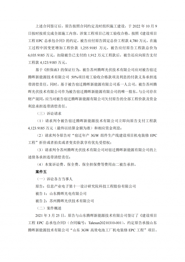 1月7日,太極實業(yè)發(fā)布公告,公司子公司信息產(chǎn)業(yè)電子第十一設(shè)計研究院科技工程股份有限公司(以下簡稱“十一科技”)與蘇州騰暉光伏技術(shù)有限公司(以下簡稱“蘇州騰暉”)及其子公司存在建設(shè)工程施工合同糾紛,十一科技已向法院提起訴訟及財產(chǎn)保全。本次相關(guān)訴訟案件共6件,合計涉案金額約3.88億元。目前,上述六起案件僅一件已被法院受理,其余訴訟案件,十一科技均已向法院遞交訴訟材料,目前正處于受理中。