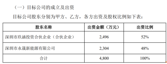 聯(lián)合出資競拍,加速布局新能源領域本次公告顯示,深圳永晟與玖涵投資共同成立的合資公司注冊資本為4800萬元,其中玖涵投資以人民幣現(xiàn)金出資2496萬元,占注冊資本的52%;深圳永晟以人民幣現(xiàn)金出資2304萬元,占注冊資本的48%。
