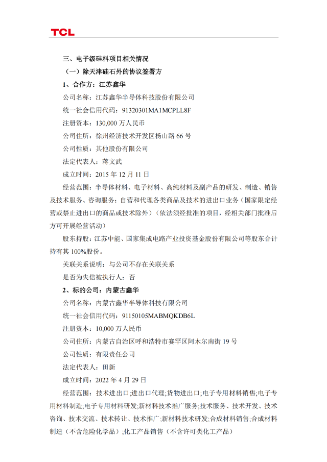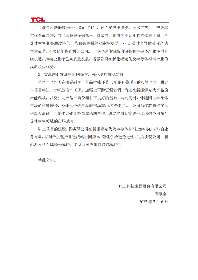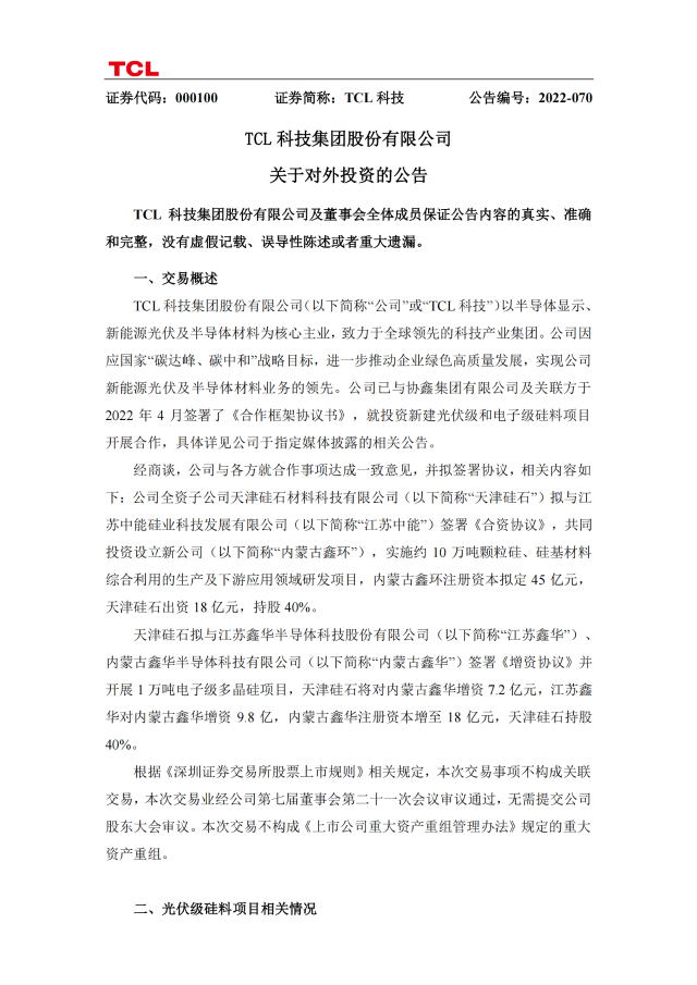 7月7日,TCL科技發(fā)布公告稱,今年4月與協(xié)鑫集團(tuán)有限公司及關(guān)聯(lián)方簽訂《合作框架協(xié)議書》,就投資新建光伏級(jí)和電子級(jí)硅料項(xiàng)目開(kāi)展合作。