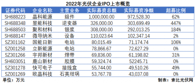 2022年,A股市場共有10家光伏企業(yè)完成IPO并成功上市,募資總額達(dá)到214.16億元,占A股市場5870億募資總額的比重為3.65%。值得一提的是,晶科能源募資總額高達(dá)100億元,是A股市場中僅有的五家達(dá)到百億級別的企業(yè)。此外,受益于廣闊的發(fā)展前景,機(jī)構(gòu)投資者對于光伏企業(yè)也頗為“慷慨”,像昱能科技、聚和材料超募比例分別達(dá)到447%和184%。