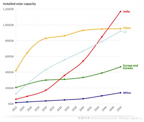 近年來,印度光伏市場發(fā)展迅速,光伏裝機始終保強勁增長。截至2023年6月30日,印度可再生能源發(fā)電的累計裝機容量達到129.6GW,太陽能約占可再生能源總裝機容量的54%。美國能源信息署(IEA) 《國際能源展望》報告預測稱,至2050年,印度的太陽能裝機容量將在全球占據(jù)主導地位。