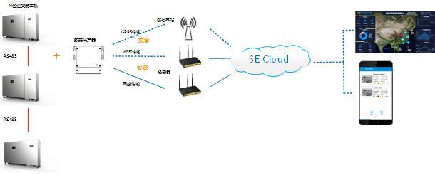 該方案中,多臺(一般小于20臺)逆變器通過RS485串聯(lián)后,配置一個通訊配件(GPRS/Wifi/WLAN模塊),系統(tǒng)配置原理圖如下: