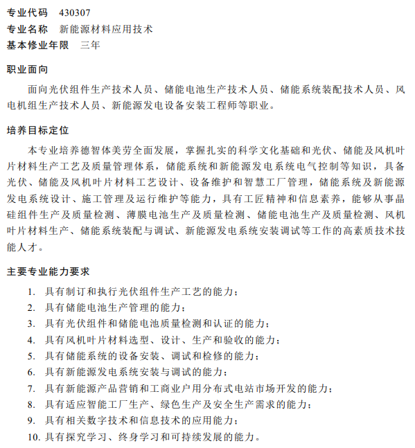 在中等職業(yè)教育中,包括光伏工程技術(shù)與應(yīng)用專業(yè)、太陽能與沼氣技術(shù)利用兩個專業(yè)。高等職業(yè)教育專科專業(yè)中,包括光伏工程技術(shù)、新能源材料應(yīng)用技術(shù)兩個專業(yè)。高等職業(yè)教育本科專業(yè)中僅有新能源材料應(yīng)用技術(shù)一個相關(guān)專業(yè)。