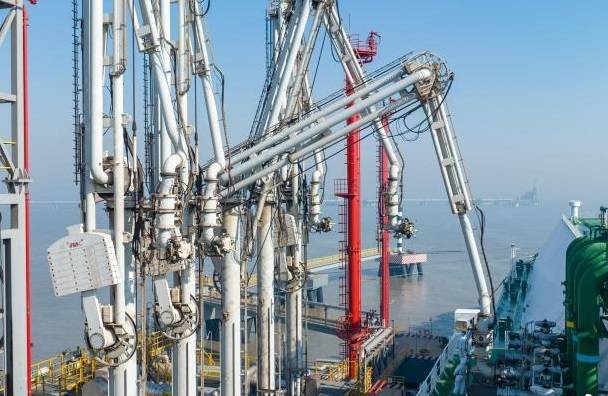 操作員正在連接LNG卸料臂,準備接卸LNG?!〖敬禾?攝