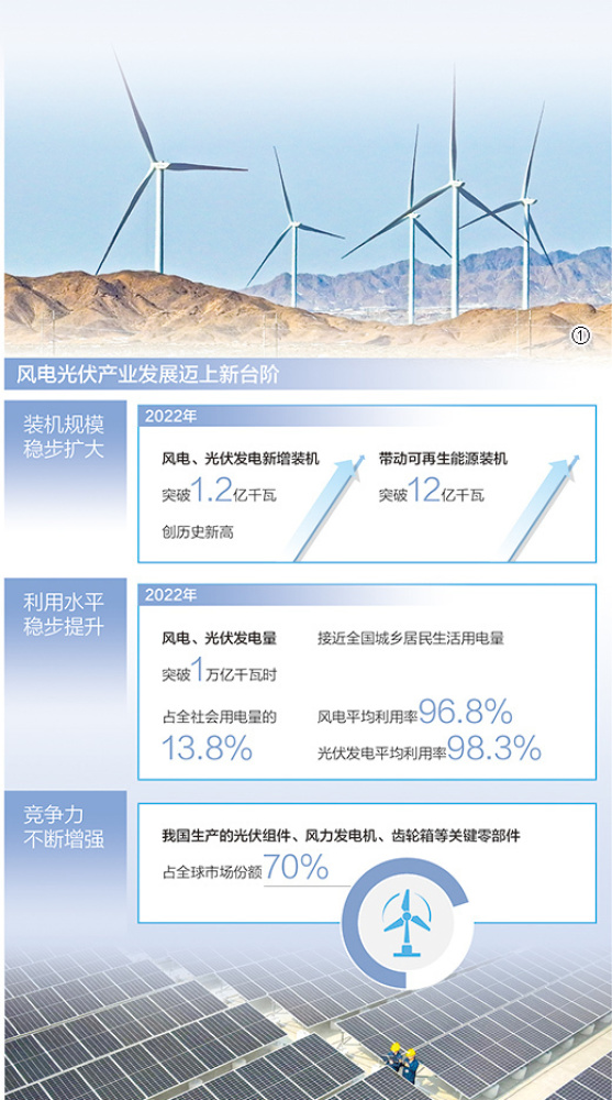 出口總額超過512億美元,同比增長80.3%——2022年,我國光伏產(chǎn)業(yè)在國際市場的表現(xiàn)亮眼。歷經(jīng)多年深耕細(xì)作,我國風(fēng)電光伏產(chǎn)業(yè)競爭力大幅提升,光伏組件、風(fēng)力發(fā)電機(jī)、齒輪箱等關(guān)鍵零部件占全球市場份額的比重提升至70%。在國內(nèi),風(fēng)電光伏也已成為新增發(fā)電裝機(jī)和新增發(fā)電量的主體,2022年占比分別達(dá)到78%和55%以上,累計(jì)裝機(jī)突破7億千瓦,相當(dāng)于30多個(gè)三峽電站。