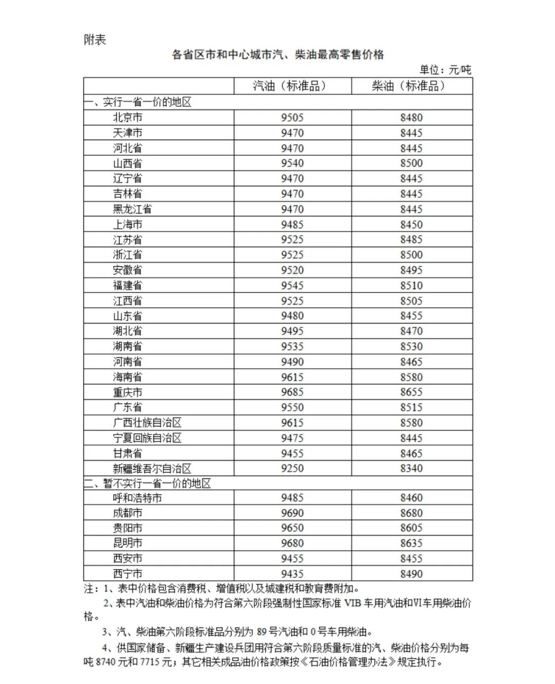 附:各省區(qū)市和中心城市汽、柴油最高零售價(jià)格