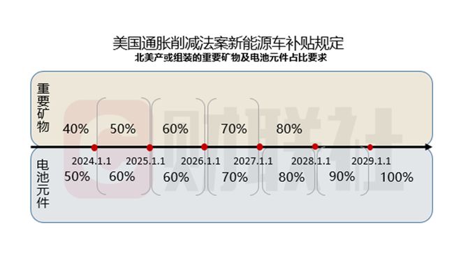 按照法案,在2024年1月1日前,40%的礦物和50%的電池元件需滿足上述的“北美原則”。