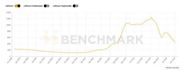 從2018年10月至今的基準(zhǔn)鋰價(jià)格指數(shù)(按市場(chǎng)交易量加權(quán)) 來源:Benchmark Mineral Intelligence