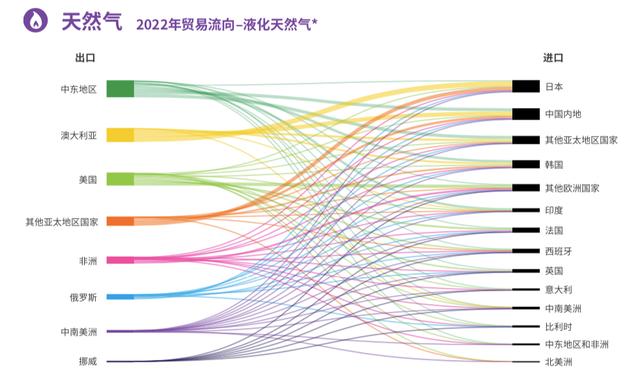 2022年,國際液化天然氣貿(mào)易量占所有地區(qū)間天然氣貿(mào)易量的56%,總量達(dá)到5,420億立方米,較上一年增長5%。中東地區(qū)是最大的液化天然氣出口地區(qū),與澳大利亞和美國合計占液化天然氣出口總量的65%。日本是最大的液化天然氣進(jìn)口國,進(jìn)口量達(dá)980億立方米,與中國合計占全球進(jìn)口總量的35%。亞太地區(qū)的進(jìn)口量約占液化天然氣進(jìn)口總量的65%,歐洲地區(qū)緊隨其后,占比超過30%。
