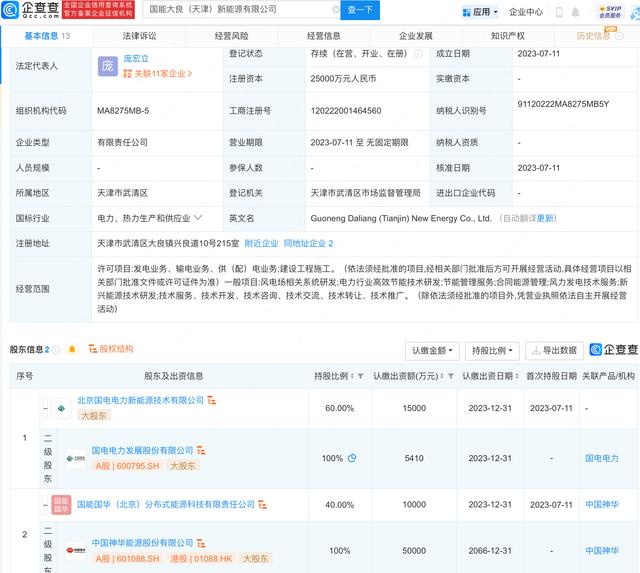 企查查APP顯示,近日,國能大良(天津)新能源有限公司成立,法定代表人為龐宏立,注冊(cè)資本2.5億元人民幣,經(jīng)營范圍包含:風(fēng)電場(chǎng)相關(guān)系統(tǒng)研發(fā);電力行業(yè)高效節(jié)能技術(shù)研發(fā);節(jié)能管理服務(wù);合同能源管理等。企查查股權(quán)穿透顯示,該公司由國電電力(600795)、中國神華(601088)間接共同持股。