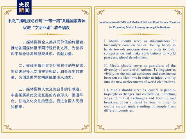 儀式上,發(fā)布了《中央廣播電視總臺與“一帶一路”共建國家媒體促進“文明互鑒”聯(lián)合倡議》,呼吁媒體要做全人類共同價值的傳播者、世界文明多樣性的守護者、人文交流合作的引領者。