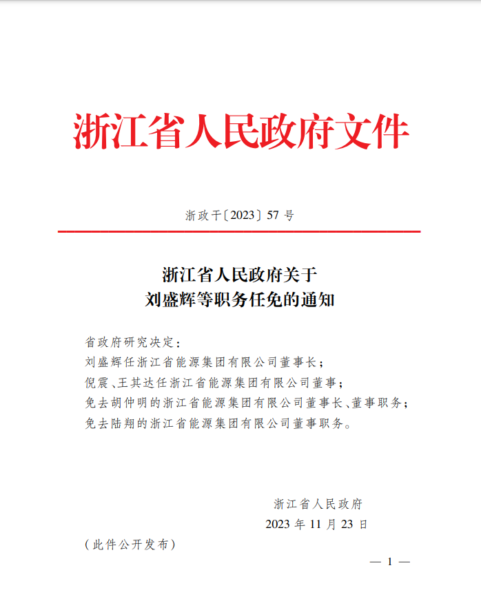 近日,據(jù)浙江省政府文件顯示,經(jīng)研究決定,劉盛輝任浙江省能源集團(tuán)有限公司董事長(zhǎng);倪震、王其達(dá)任浙江省能源集團(tuán)有限公司董事;免去胡仲明的浙江省能源集團(tuán)有限公司董事長(zhǎng)、董事職務(wù);免去陸翔的浙江省能源集團(tuán)有限公司董事職務(wù)。
