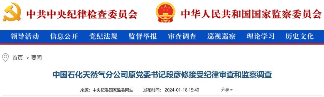 中央紀委國家監(jiān)委網(wǎng)站1月18日消息,據(jù)中國石化紀檢監(jiān)察組、山東省紀委監(jiān)委消息:中國石化天然氣分公司原黨委書記段彥修涉嫌嚴重違紀違法,目前正接受中國石化紀檢監(jiān)察組和山東省濱州市監(jiān)委紀律審查和監(jiān)察調(diào)查。