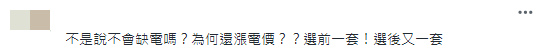 相關(guān)消息也引起島內(nèi)網(wǎng)民吐槽,有網(wǎng)民在臺媒留言區(qū)批評稱,“不是說不會缺電嗎?為何還漲電價?選前一套!選后又一套”。