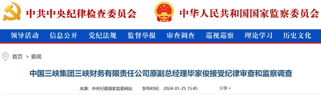 中央紀(jì)委國(guó)家監(jiān)委網(wǎng)站1月25日消息,據(jù)中國(guó)三峽集團(tuán)紀(jì)檢監(jiān)察組、湖北省紀(jì)委監(jiān)委消息:中國(guó)三峽集團(tuán)三峽財(cái)務(wù)有限責(zé)任公司原副總經(jīng)理畢家俊涉嫌嚴(yán)重違紀(jì)違法,目前正接受中國(guó)三峽集團(tuán)紀(jì)檢監(jiān)察組和湖北省天門市監(jiān)委紀(jì)律審查和監(jiān)察調(diào)查。