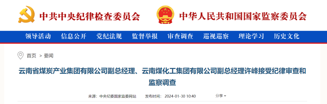 中央紀(jì)委國家監(jiān)委網(wǎng)站1月30日,據(jù)云南省紀(jì)委監(jiān)委消息:云南省煤炭產(chǎn)業(yè)集團(tuán)有限公司副總經(jīng)理、云南煤化工集團(tuán)有限公司副總經(jīng)理許峰涉嫌嚴(yán)重違紀(jì)違法,主動投案,目前正接受云南省紀(jì)委監(jiān)委紀(jì)律審查和監(jiān)察調(diào)查。