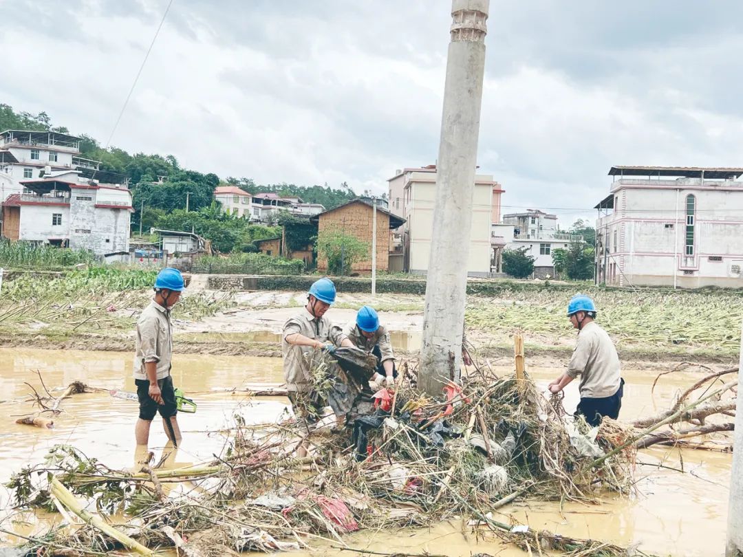 ▲圖為6月17日,國網(wǎng)福建永定區(qū)供電公司支援搶修隊伍對上杭縣10千伏稔洪線電桿傾斜現(xiàn)場開展搶修工作。黃小芬/攝