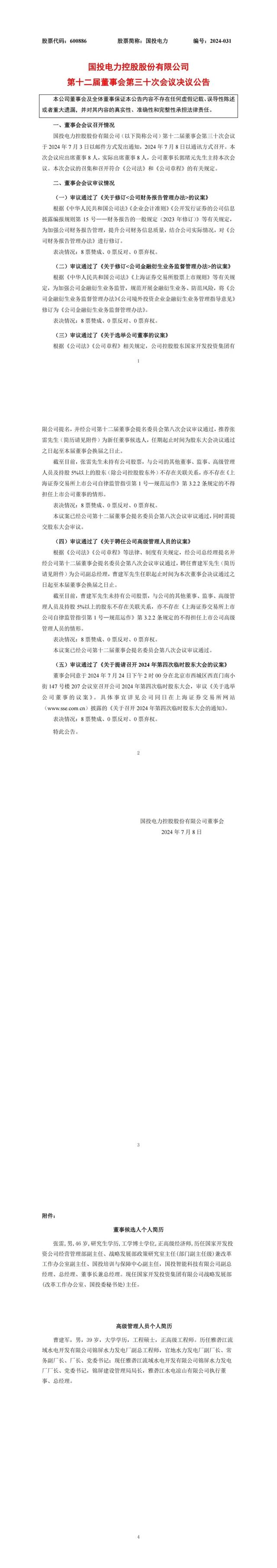 7月8日,國投電力召開董事會,審議通過了《關(guān)于聘任公司高級管理人員的議案》,聘任曹建軍先生為公司副總經(jīng)理,曹建軍先生任職起止時間為本次董事會決議通過之日起至本屆董事會換屆之日止;推薦張雷為新任董事候選人。