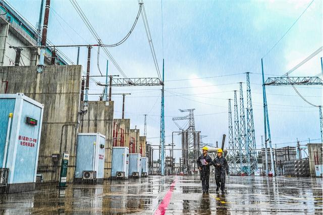 國(guó)網(wǎng)河南直流中心運(yùn)維人員在±800千伏特高壓中州換流站開展暴雨天氣特巡。