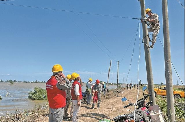 國(guó)家電網(wǎng)江蘇電力(南京)共產(chǎn)黨員服務(wù)隊(duì)隊(duì)員在水陽(yáng)江圩堤搭設(shè)臨時(shí)線路。