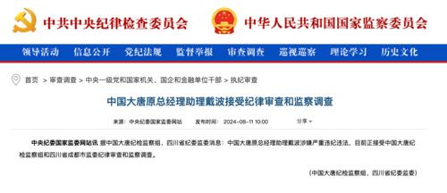8月11日,中央紀委國家監(jiān)委網(wǎng)站發(fā)布消息,據(jù)中國大唐紀檢監(jiān)察組、四川省紀委監(jiān)委消息,中國大唐原總經(jīng)理助理戴波涉嫌嚴重違紀違法,目前正接受中國大唐紀檢監(jiān)察組和四川省成都市監(jiān)委紀律審查和監(jiān)察調(diào)查。